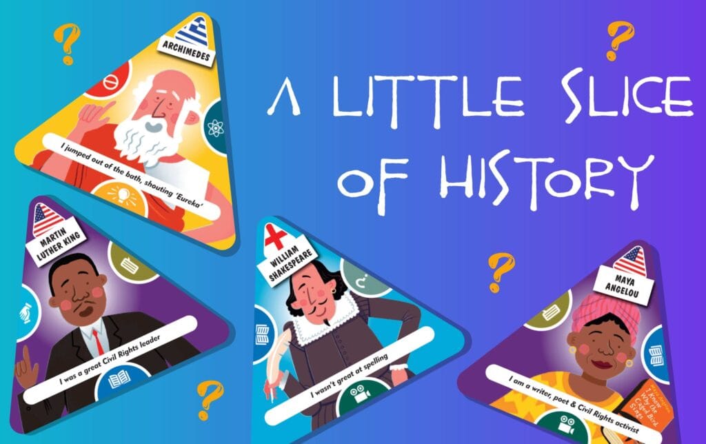 A mighty game in a mini box: Have fun and challenge your chums as you match History Heroes cards to make surprising connections with our card game, A LITTLE SLICE OF HISTORY. Be the first player to get rid of all your cards by aligning matching sides. Sneaky event cards, including the powerful Superslice, may thwart players’ best laid plans to win! A brilliant family game for all ages from 6 – 80+. Pop it in your pocket, your bag or the glove compartment: the perfect boardless board game and the perfect travel game to play out and about, on holiday and at home!